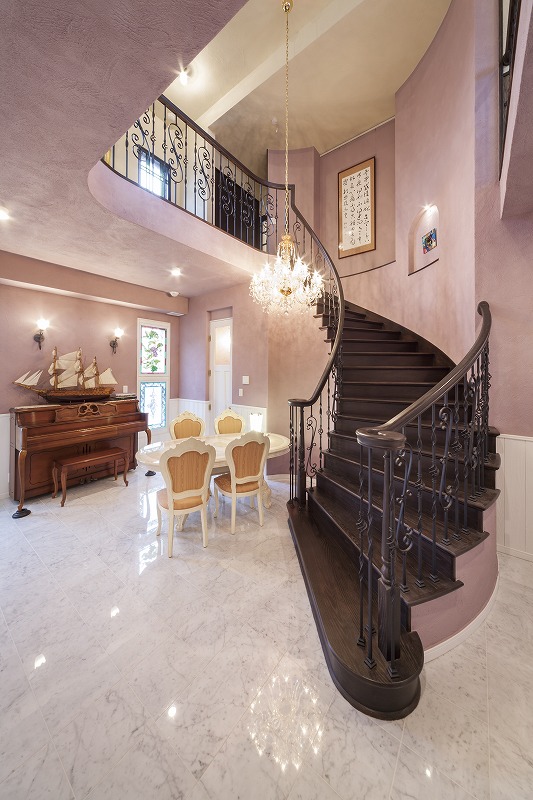 大理石が敷き詰められた玄関ホールの吹き抜けには圧巻のサーキュラー階段。