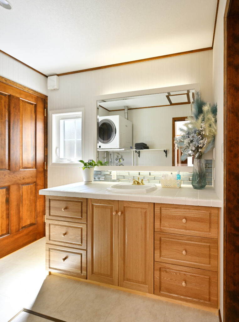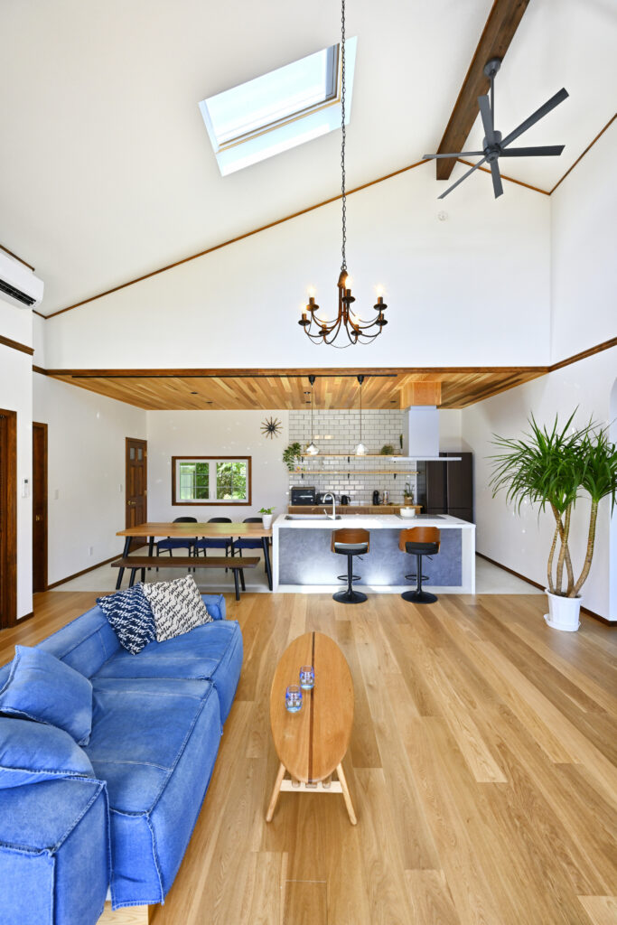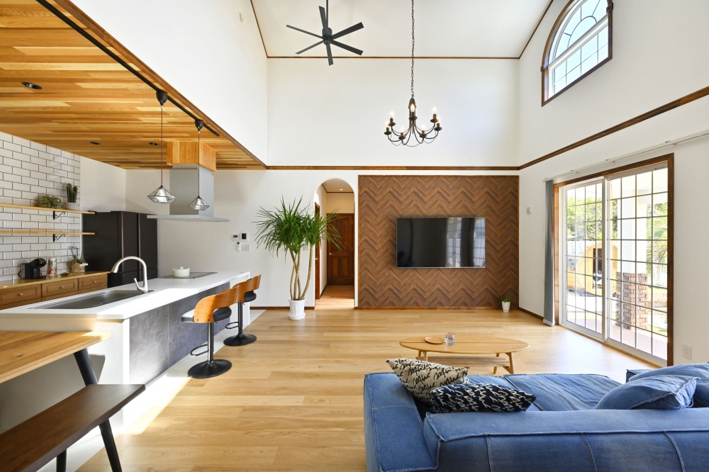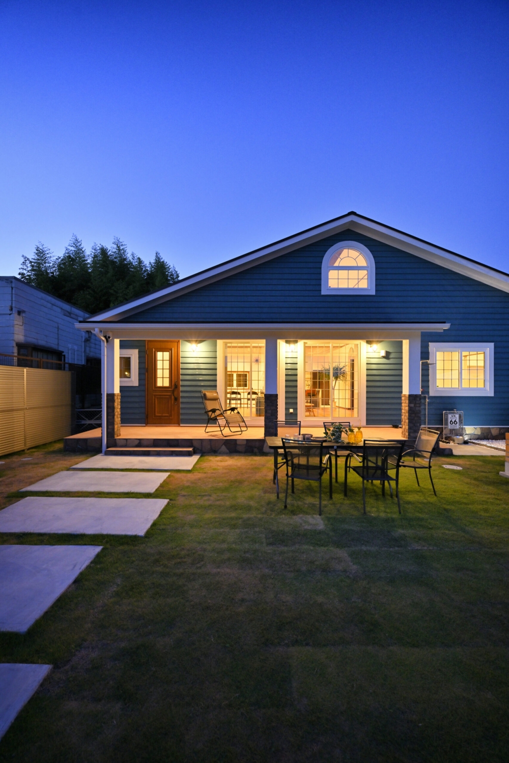 | コンセプト | 海をイメージしたブルーが爽やかなアメリカンハウスのT邸はリゾート感たっぷり。「大人数が集まってもゆったりと過ごせるリビングにしたかったんです」とTさんが話すように、LDKは28.7畳を確保。広々とした面積に加え、約5mの天井高やリビングの窓からカバードポーチ、さらには庭へと視線が抜けることで、空間が縦にも横にも広がり、より一層開放感を楽しめる空間となっている。「別荘として過ごすために建てたので、自宅ではできないことを詰め込みました。スタッフさんは友人感覚で相談がしやすいだけでなく、豊富な経験からさまざまなアドバイスをくれたので、心強かったですね。デザインも含めて理想の家が完成しました」と話すTさん。ドッグランとしても使える庭には、BBQコンロ、ジェットバス、サウナを用意。休日は愛犬も連れてこの別荘で過ごすのが家族の楽しみになっているそう。「別荘では子どもたちがケンカをせず、仲良く遊んでいます。子どもたちがジェットバスや庭で遊んでいる間、大人はゆっくりと食事を楽しむなど、思い描いていた最高の時間を過ごせています」。 |