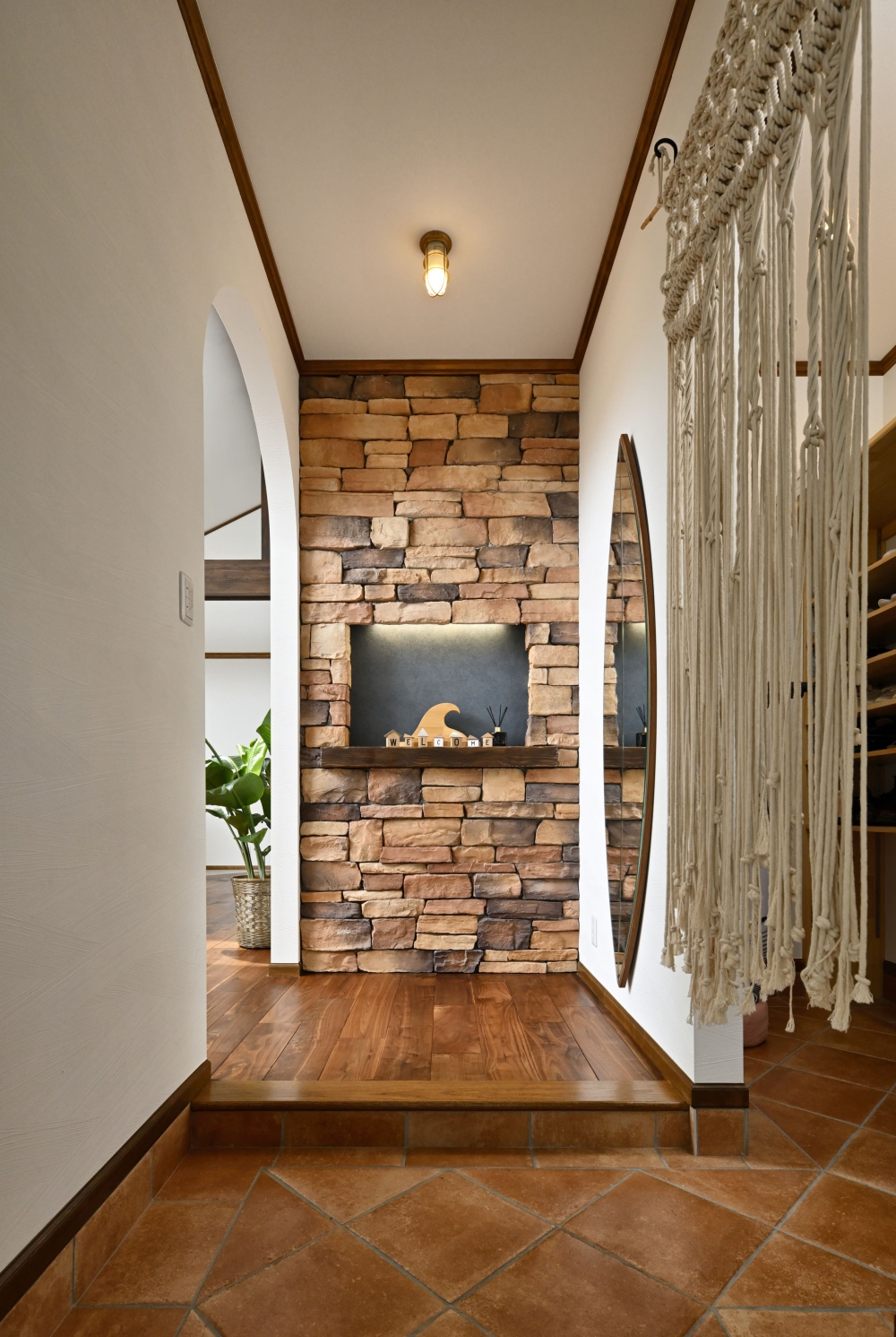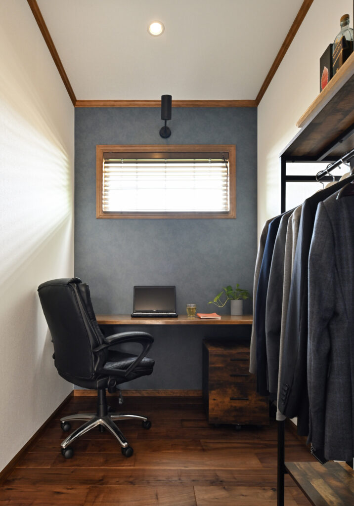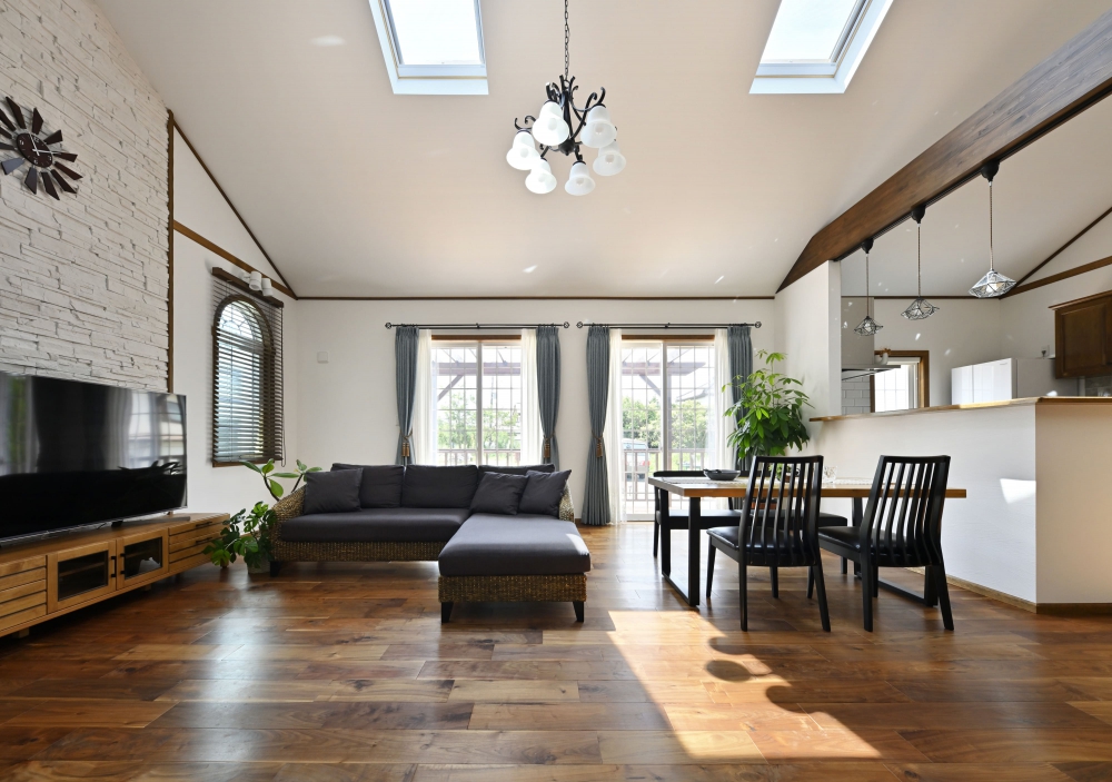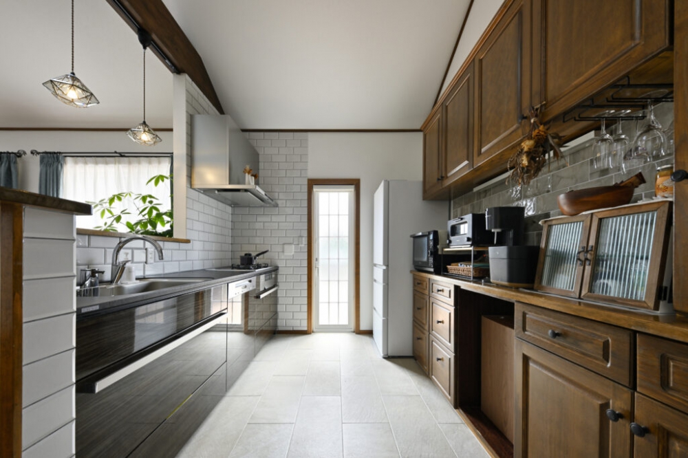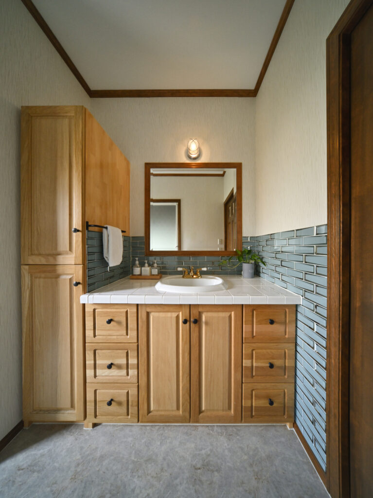 | コンセプト | 「ハワイのコンドミニアムのようなリゾート感たっぷりの空間にしたい」と考えていたTさん。完成した家は、爽やかなブルーが目を惹くアメリカンテイストの平屋。パーゴラを設置した広々としたテラスは、お子さんの遊び場として活躍したり、BBQを楽しんだりするほか、夜ライトアップすると幻想的でまるでリゾートにいるような気分を満喫できる。一方、白とブラックウォールナットの色合いを基調に落ち着いた雰囲気に仕上げた室内。まず驚くのが、LDKの開放感だ。勾配天井による高さと天窓によって明るく、開放的な空間となっている。「人を招くことも多いので、ホームパーティなどの時でも広く使えるよう、キッチンもゆとりのある設計にしています」とTさん。キッチンのキャビネットは同社のハンドメイド。使い勝手を考えて棚をカスタマイズしたほか、色はリビングダイニングのブラックウォールナットの無垢床と揃えている。そのほか、洗面台もハンドメイドで輸入物のゴールドの水栓を組み合わせるなど、こまかな部分にまでこだわりを反映。「気密・断熱性がよく、一年を通して住み心地がいいですね。テラスでご飯を食べたり、リビングで寛いだり、家族で過ごす時間が楽しいです」。 |