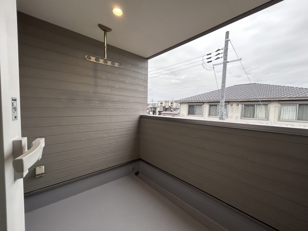 外干しがお好きな方に必須のバルコニーです。このバルコニーはインナーバルコニーになっているため、小雨程度では洗濯物が濡れません。洗濯物やお布団を外で干したい方や、ちょっとしたプライベートな屋外空間が欲しい方には、バルコニーの設置をおすすめします。