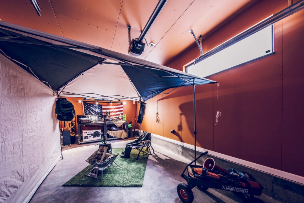 愛車が映えるようガレージの壁面は全面オレンジに塗装! 家族が集まるリビングはマリン、2階はヴィンテージ。フロアごとにテイストを分けて雰囲気の違いを楽しむ。 ブラックの窓枠と格子がお部屋と外観のアクセントに。 帰宅してすぐ使える、玄関横の手洗いスペース。