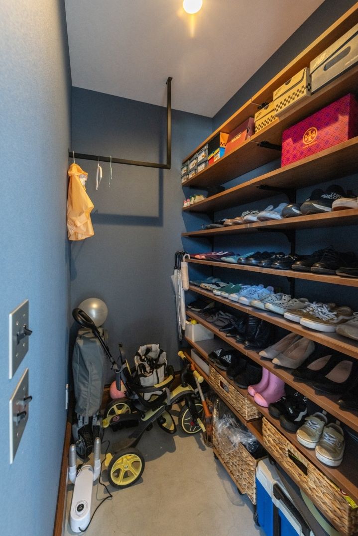 玄関横のシューズクロークは、家族の靴やお子様の遊び道具などたくさん収納できる。アイアンバーにはコートや雨具も掛けられる。