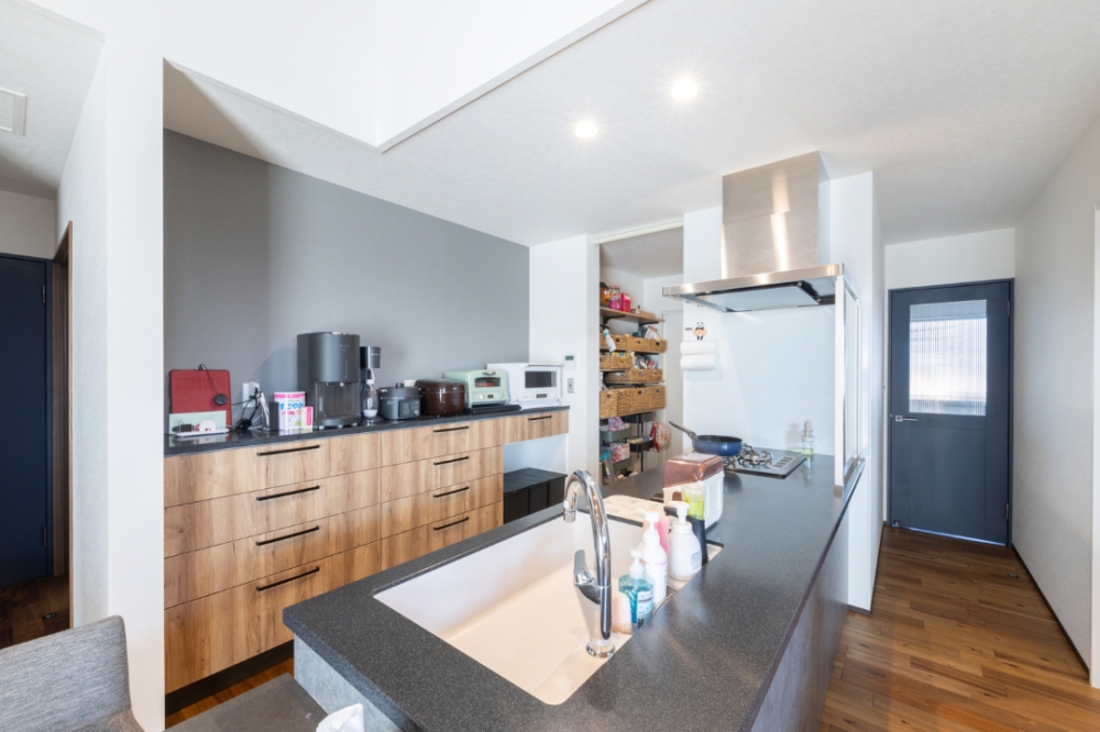 買い物帰りは、玄関からパントリーに移動できるので便利。生活感の出やすい冷蔵庫もパントリーに隠す工夫も。