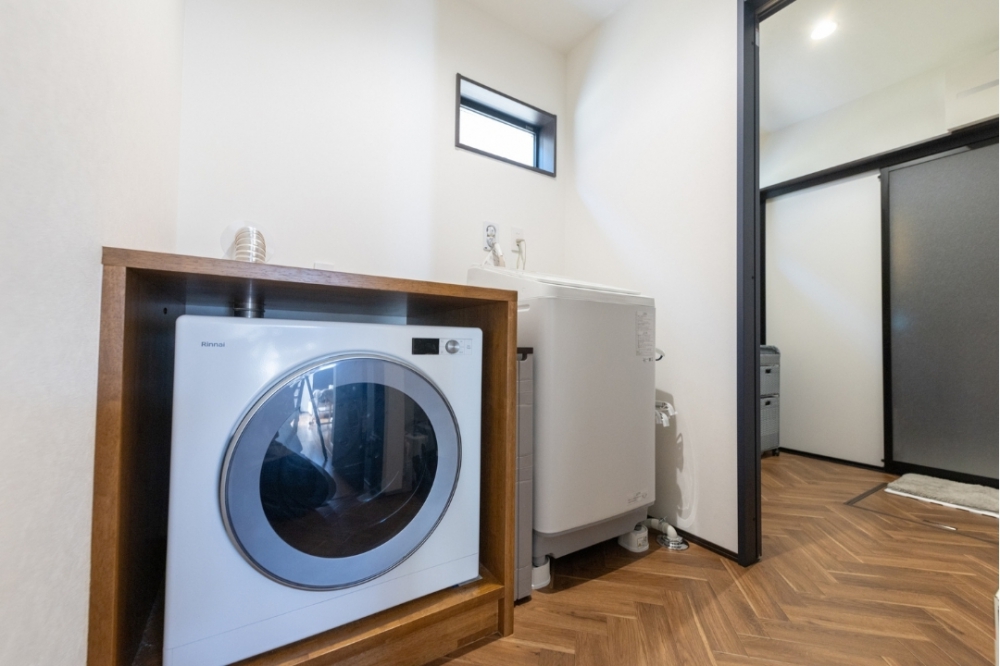ランドリー室と浴室。ガス衣類乾燥機の乾太くんは家事の時短に大活躍。乾太くんを設置する高さも取り出しやすい位置にし、乾いた衣類もその台を使ってすぐにたためる。