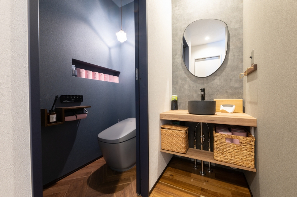 トイレと手洗い場。床材やクロスの柄は異なりますが、統一感があってオシャレ。