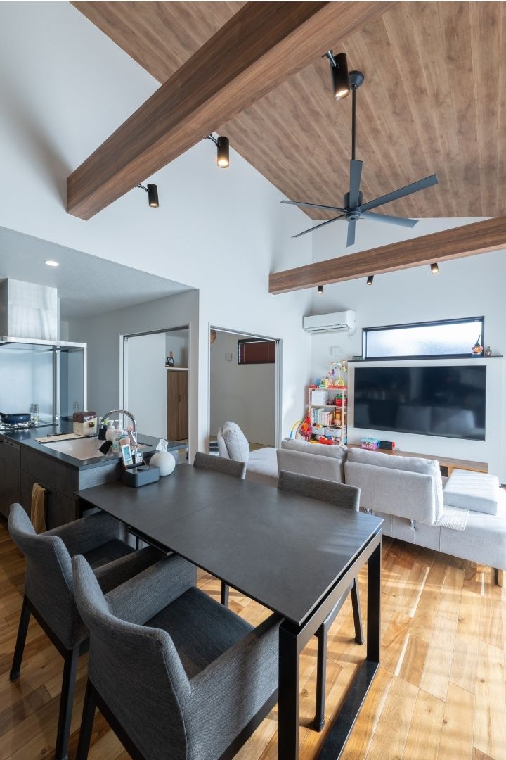 勾配天井が開放的なLDK。2本の梁も見えてオシャレさを演出。
