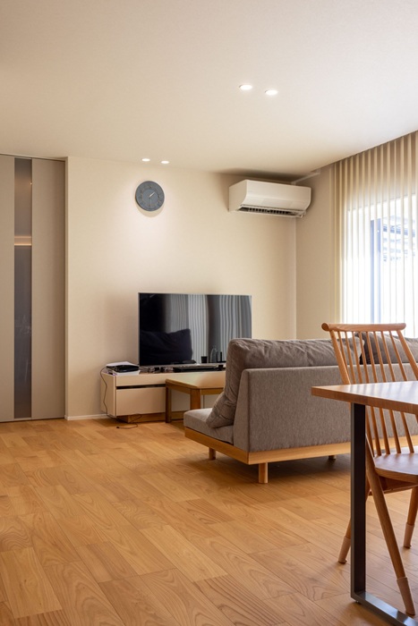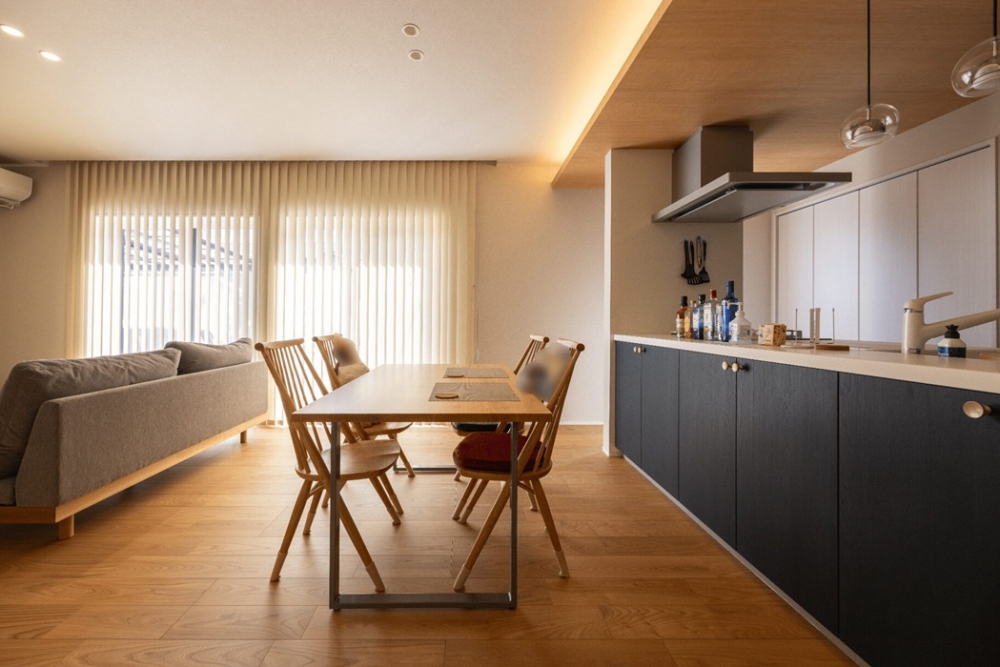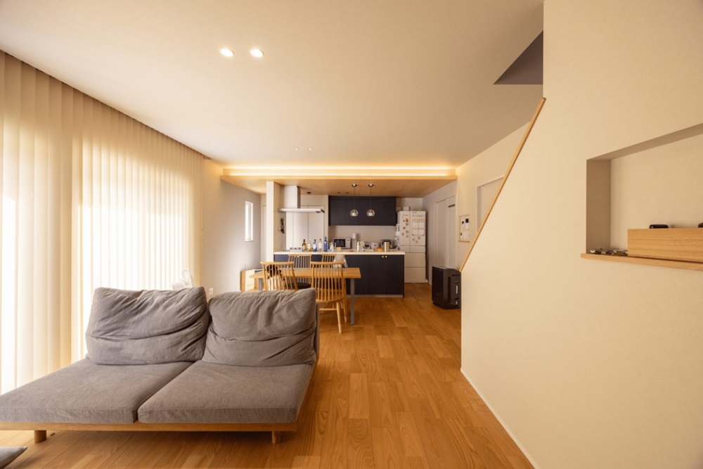 D様ご夫妻が叶えたのは、将来も見据えた1階完結型の住まい。主寝室を1階にレイアウトすることで、ワンフロアで家事・就寝・くつろぎが完結。年齢を重ねても負担の少ない、永く住み継げる間取りです。LDKはご希望だったネイビーのキッチンを主役に、木目の天井や無垢調フロアでやわらかな温もりをプラス。