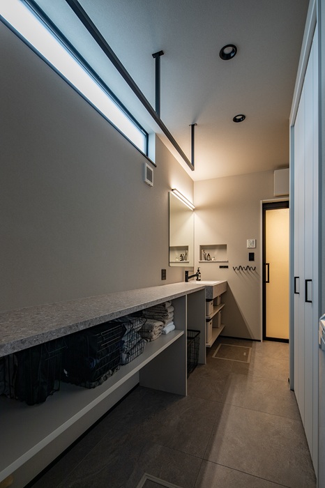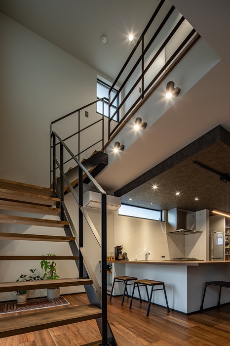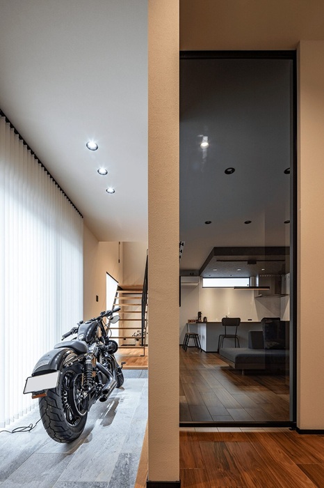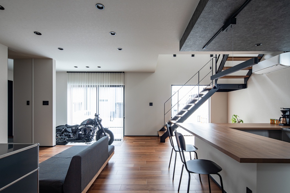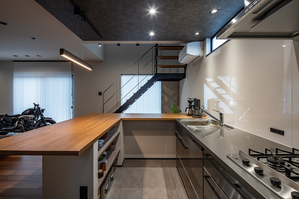 愛車を置く土間、自由度の高いキッチンなど二人のこだわりとラグジュアリー感が融合
