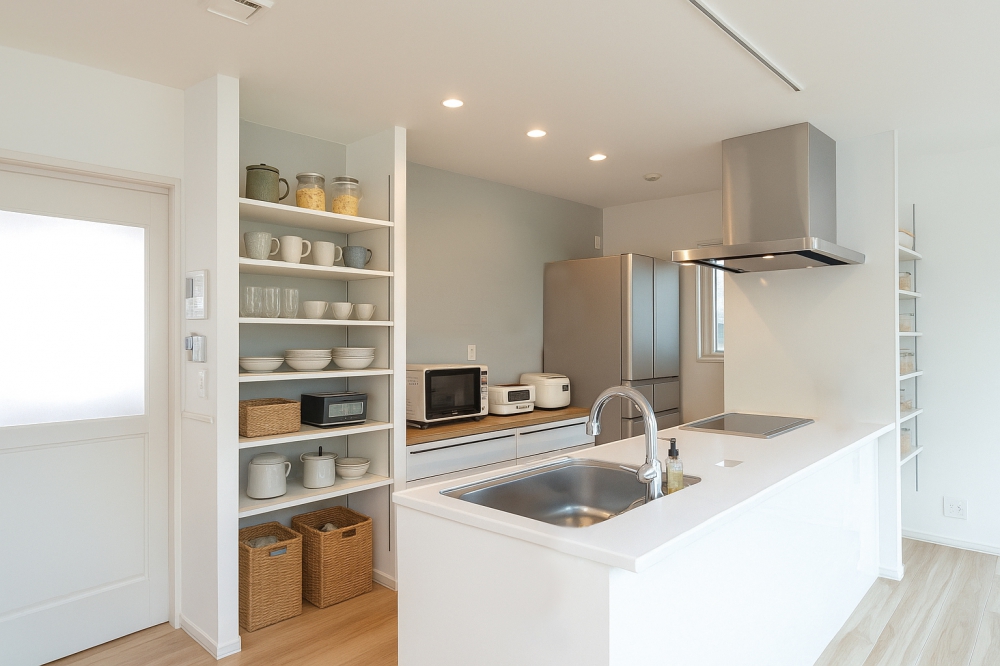 オープン収納ですっきりと整う、見せたくなるキッチン。(※写真を元に家具や小物を配置したイメージ画像です。)
