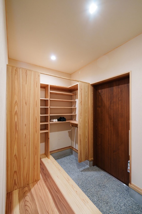 爽やかな素材の心地よさを感じられる玄関。靴や、傘などすっきり片づけられます。