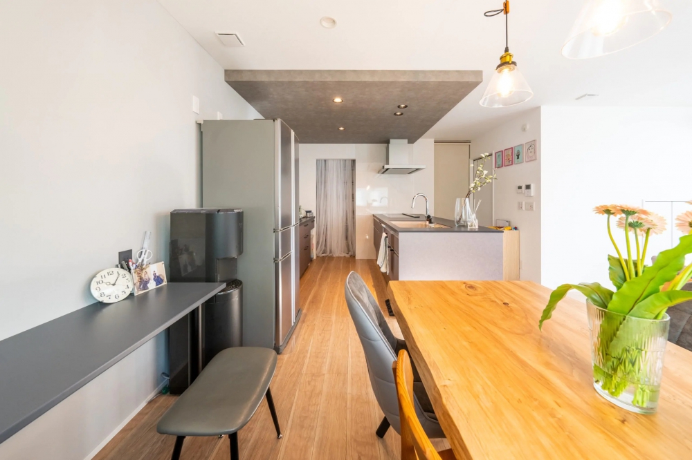 ダイニングからキッチン、収納へ。美しく流れる生活動線。