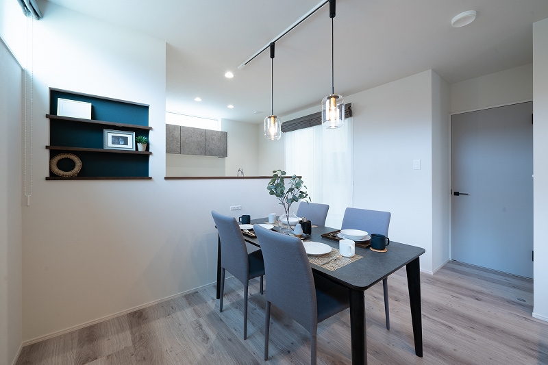 3段ニッチには、お気に入りの小物や雑貨をディスプレイすることで個性が引き立ちます。 ペンダントライトの明かりがダイニングテーブルを照らし、食事の時間を華やかに彩ります。