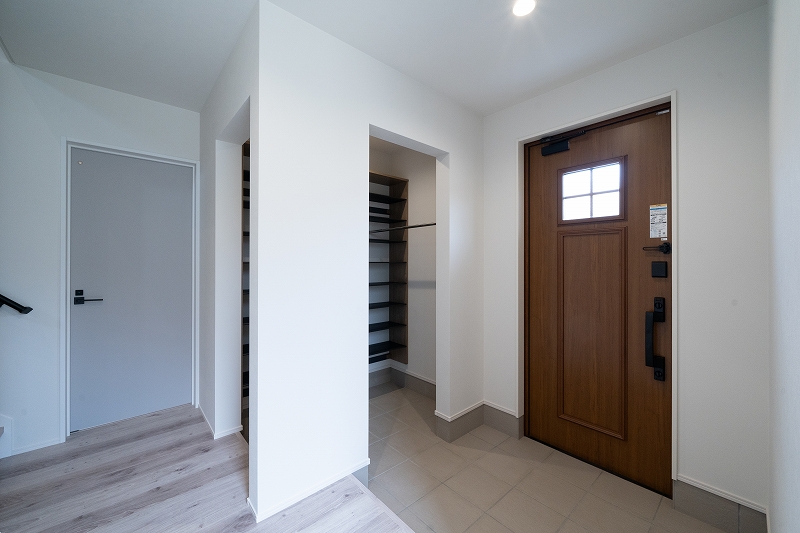 大容量のシューズクロークを設け、家族全員の靴や季節のアウターも収納できるようにしました。 ハンガーパイプも取り付けてあり、コートや上着をすぐに掛けられるので、日常使いにも便利です。