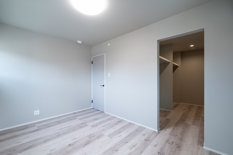 主寝室は白を基調にしたシンプルなデザインでまとめ、落ち着いた空間を演出しています。 WICも併設し、たっぷりと収納スペースを確保しました。