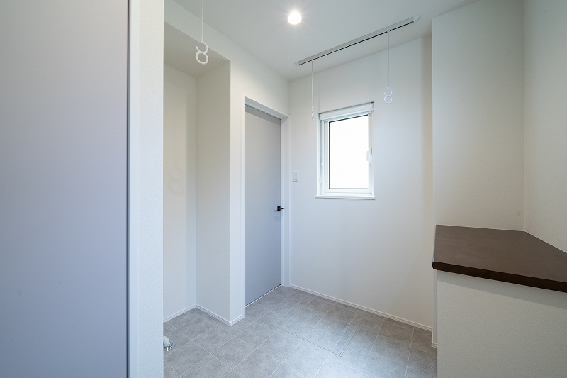 ランドリールームはユーティリティと繋がり、家事ラク導線が確保されています。 また、カウンターを設置し、洗濯物の折り畳みやアイロン掛けがその場でできるため、家事の負担が軽減されます。