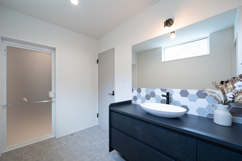 タイル貼りの造作洗面台は、グレーや紺を基調としたシックな色合いで落ち着いた雰囲気を演出。 デザイン性だけでなく機能性にも優れ、毎日の家事が楽しくなる空間となりました。
