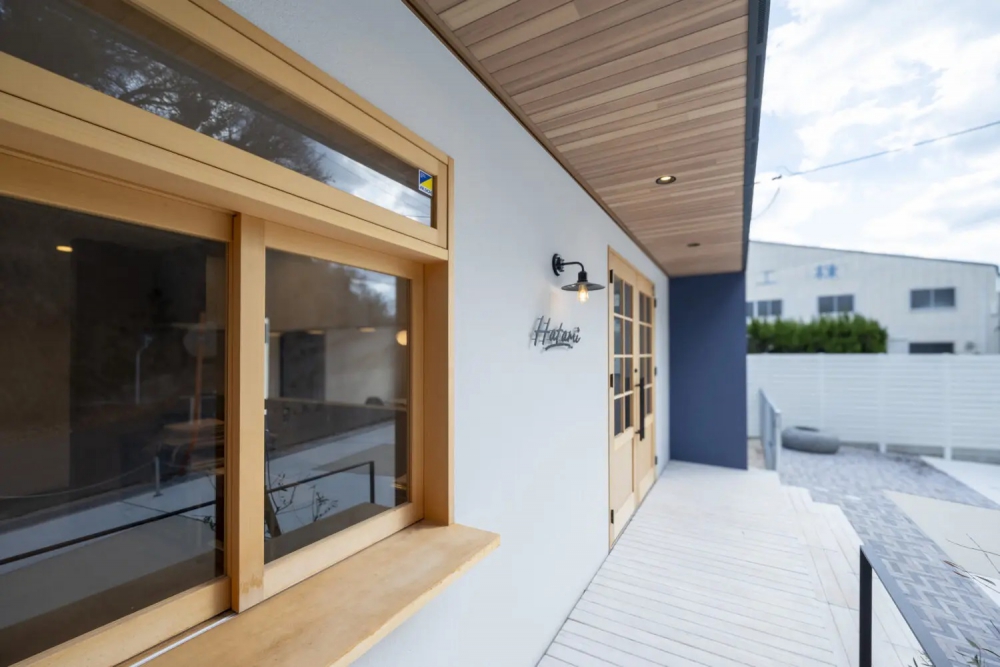 深みのあるネイビーとホワイトの外壁に、木製のドアやサッシを組み合わせた爽やかな印象のファサード。