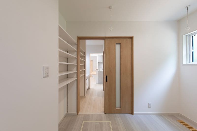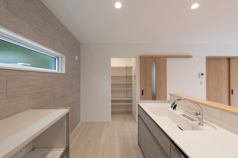 キッチン背面には大きなFIX窓を配置し、明るさと開放感をプラス。隣接のパントリーで家事動線もスムーズになりました。キッチンやカップボード、パントリーを合わせれば抜群の収納力を誇ります。
