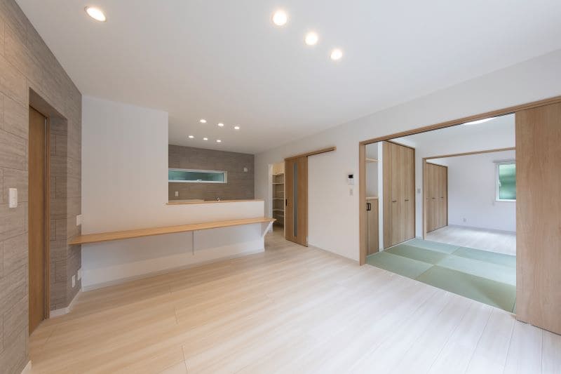日差しをたっぷり取り込む明るいリビング。キッチンカウンターは、ダイニングテーブル代わりとしてもご使用いただけるマルチ仕様です。レイアウトも自由自在なので、ソファを置いてくつろぐことも可能に。
