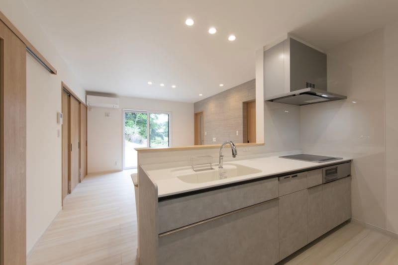 シックなグレー系のキッチンで統一。デザイン性と機能性を両立しました。お客様好みの、落ち着いた配色がポイントです。