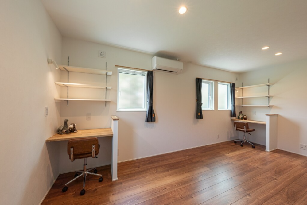 外観色は爽やかなミントグリーン。内観もお施主様の工夫がいっぱいです。