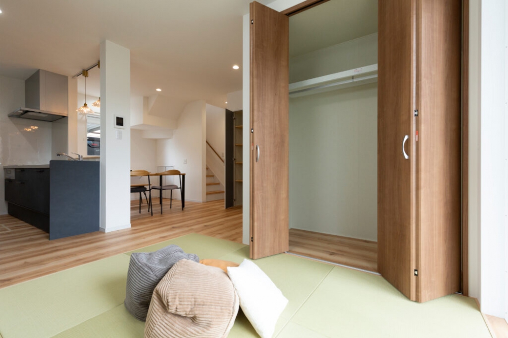 いつも笑顔の絶えないO様。元気いっぱいの姉弟のために、わくわくする住まいを考えました。延床28坪とコンパクトながら、のびのび過ごせるよう設計しています。リビングは畳スタイルとし、くつろぎと使いやすさを両立。2階にはうんていやボルダリングを取り入れ、子どもたちが楽しめる工夫を随所に盛り込んでいます。