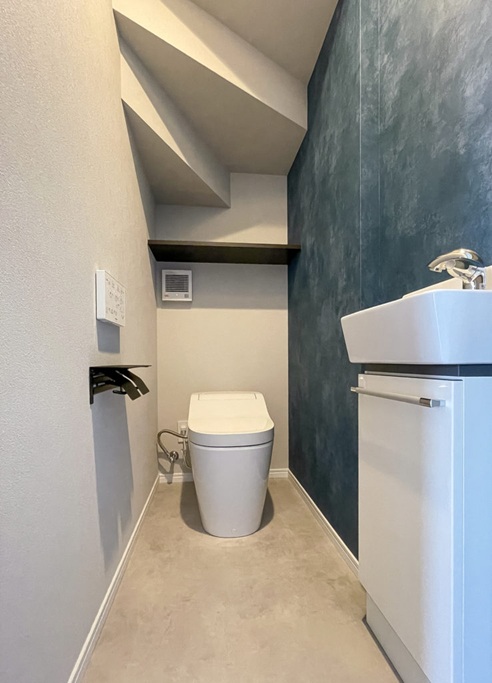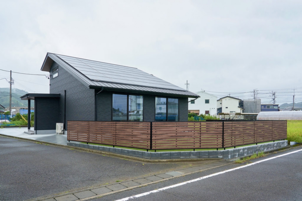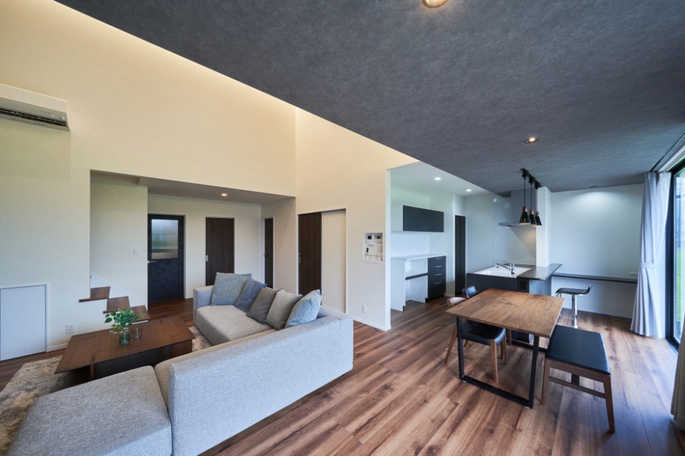 お施主様のリクエストは「とにかくカッコよく!」。当初の総二階プランから「平屋もいいよね」という半ば思い付きのような流れで、最終的には一見平屋風、じつは2階建てという家が完成。カッコよさを求めたご主人と、子育てと家事を楽にしたいという奥さま、お二人が満足する家となりました。