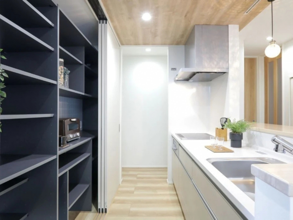 白を基調としたワークトップに、木目天井とグレーの収納棚が調和し、落ち着きのある空間に。壁付けのオープン棚は、調理家電や食材をすっきりと収められ、使い勝手も抜群。ペンダントライトや間接照明が、空間にやさしい明るさを添え、毎日の料理時間を心地よく演出します。限られたスペースでも、収納力と動線をしっかり確保した、機能美あふれるキッチンです。