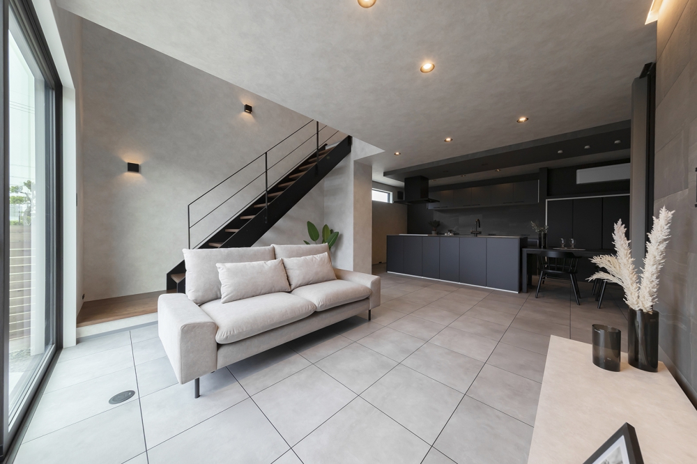 【リビングルーム】黒×グレーを基調に、タイル貼りの床+スケルトン階段がスタイリッシュな空間を演出