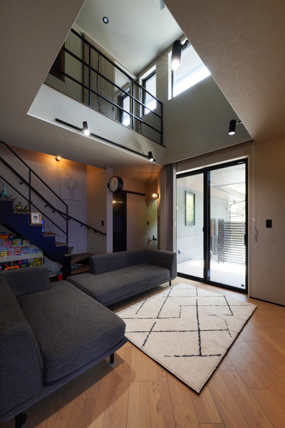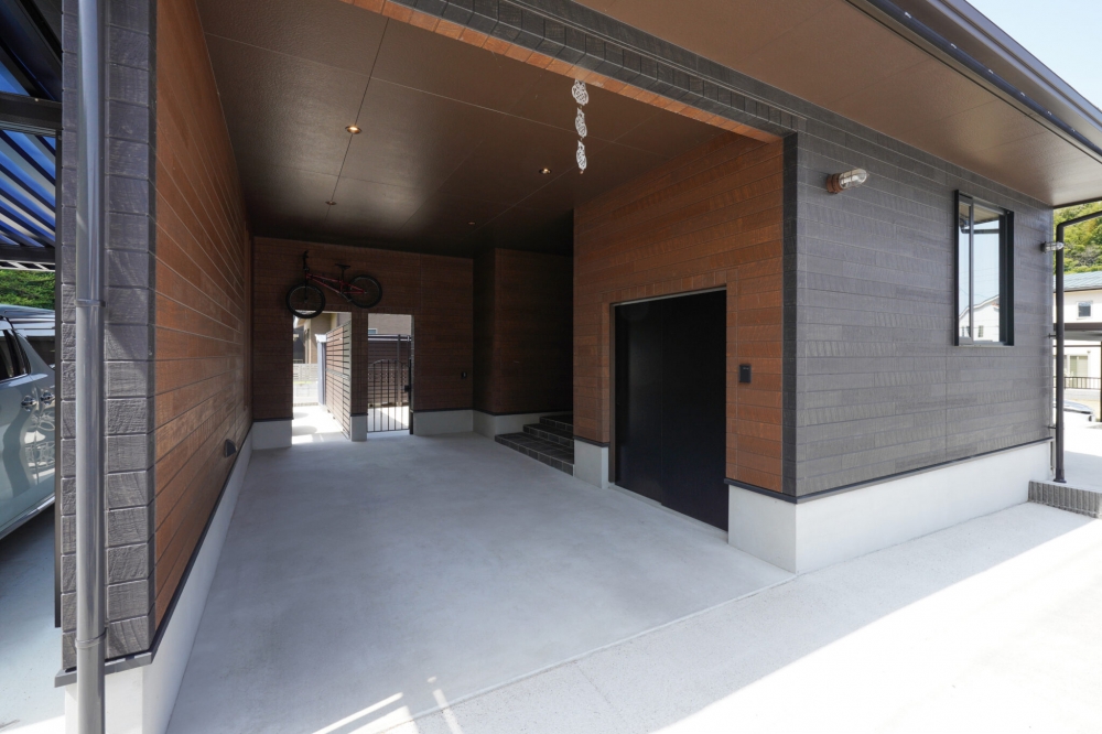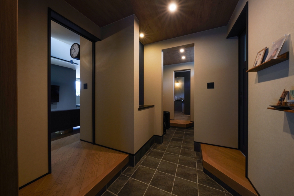 「家族の気配が感じられて、安心できる家」。そんなご夫婦の思いを込めて建てられた、住宅街の角地に立つK様邸。重厚感のあるダークトーンでまとめられた外観に、緑豊かな芝生の庭が彩りと心地よさを添えています。室内はグレーベージュを基調に、洗練されたメリハリのある空間。吹き抜けとスケルトン階段が視線を遮ることなく、開放感を際立たせています。