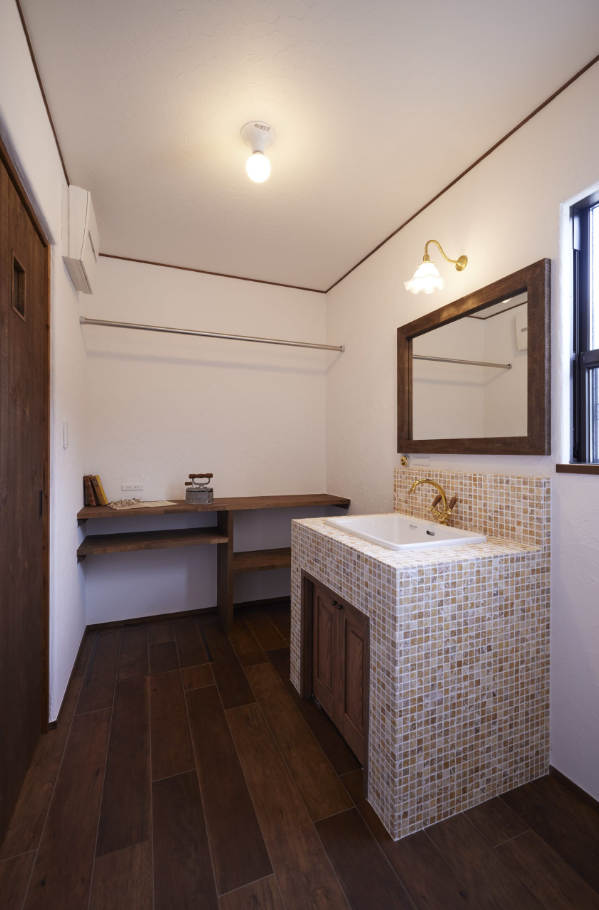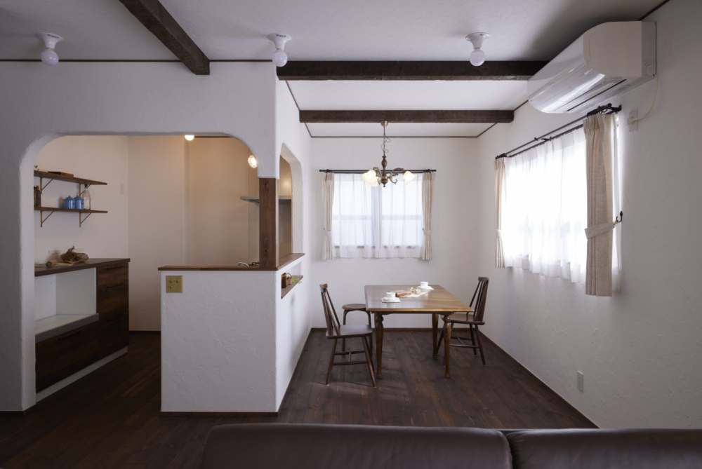 明るさを抑えたこだわりの照明。落ち着いた色合いの梁、柱、床。漆喰の塗り壁とエイジング加工された床材や梁でぬくもりのある空間に。自然光を活かしつつ、懐かしさ感じる素敵なひとときを。