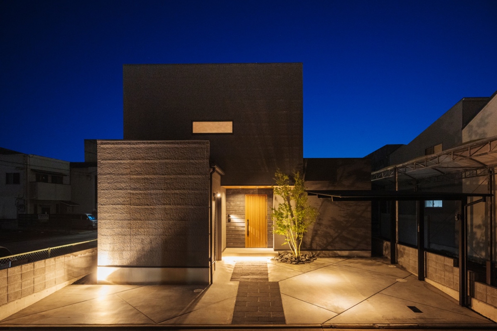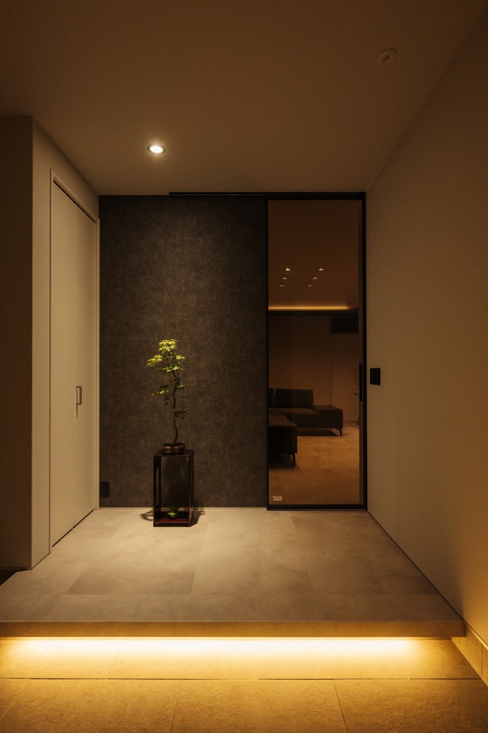 和と洋が静かに溶け合う玄関。 盆栽を照らす灯りと、框下の間接照明が生み出す陰影。