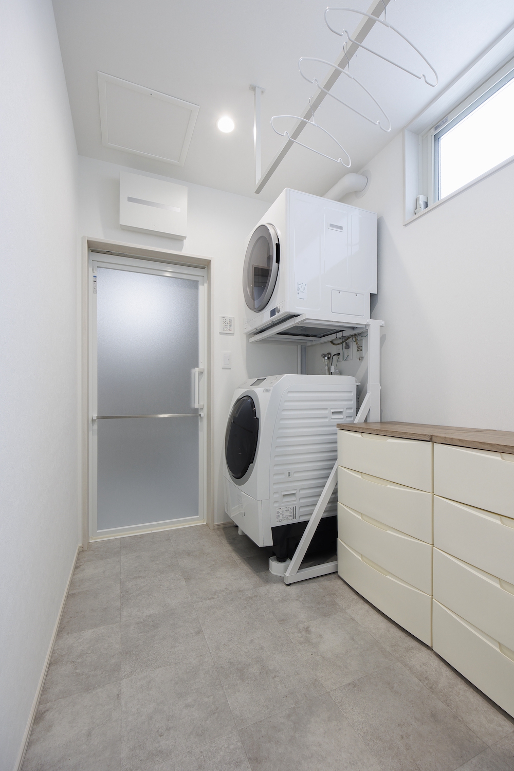 脱衣所に物干しを設置。洗濯から収納まで1部屋で完結します。