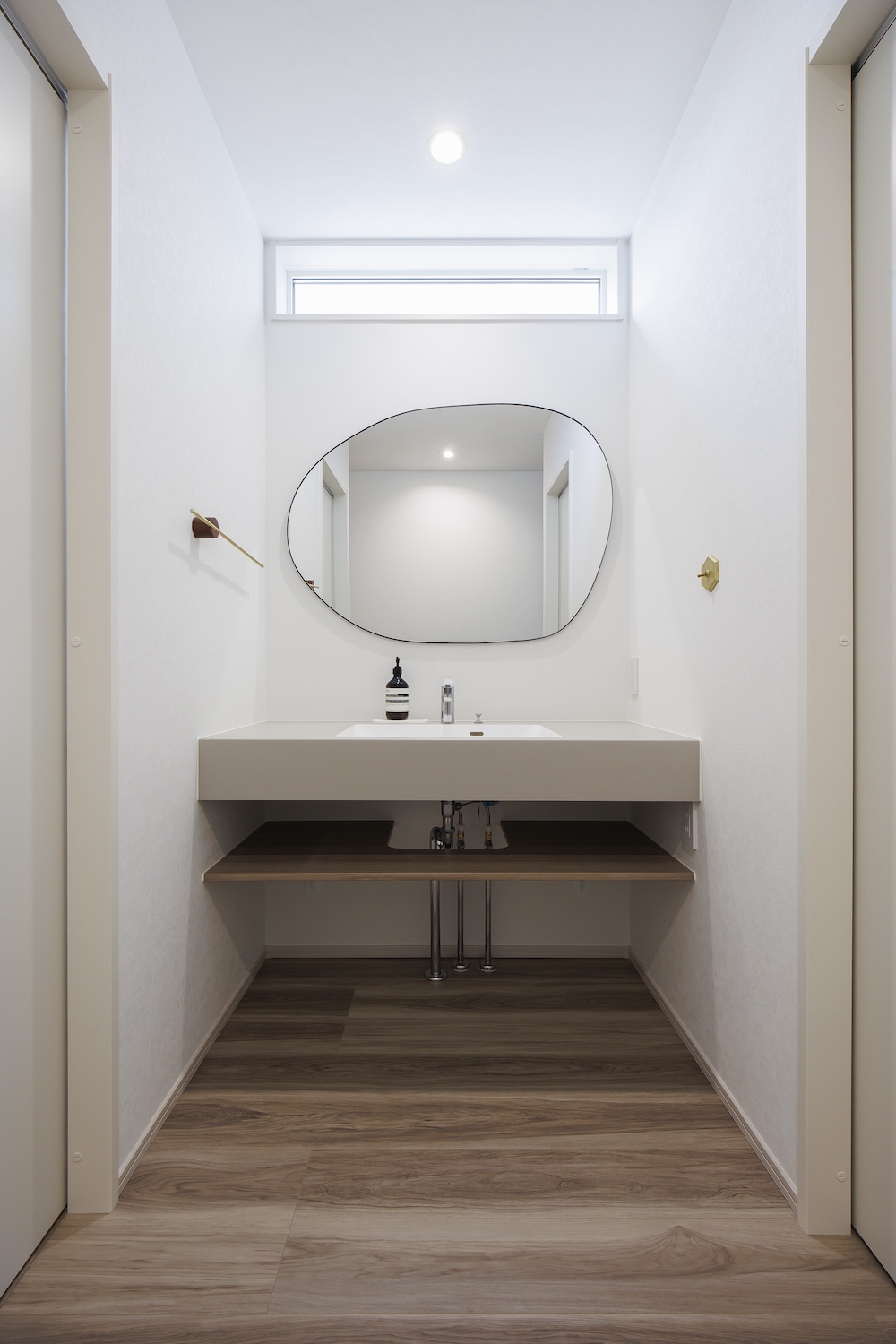 洗面台はフロータイプにし掃除がしやすいようにしています。変形型ウォールミラーがトレンド感のあるデザイン。