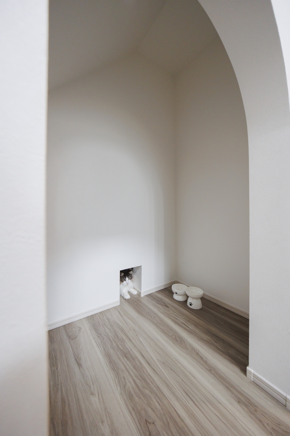 ヌックは猫ちゃんのご飯やトイレスペースとして設置。キャットドアもつけました。