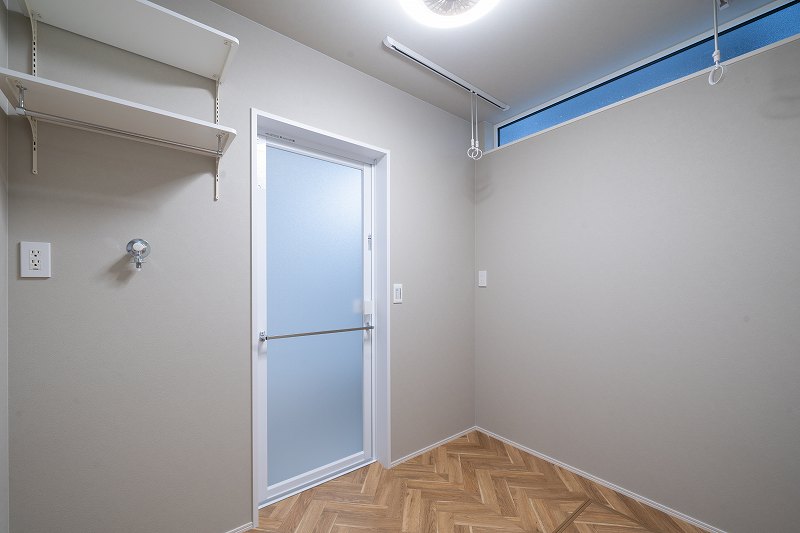 洗濯から干すまでの動作を1カ所で完結できるため、家事動線を最小限に抑えられます。 洗濯機置き場の上には可動棚を設置し、タオルや洗剤などの日用品を整理しやすくしました。