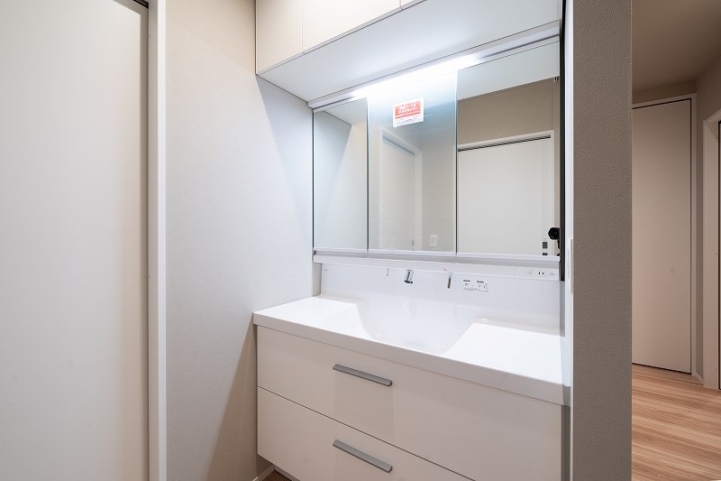 洗面室は玄関のすぐそばに配置し、帰宅後すぐに手を洗える動線を実現。 玄関ホールと洗面室の間には扉を設けず、下がり壁で空間を仕切ることで、動線を妨げずにゆるやかにゾーニングしています。