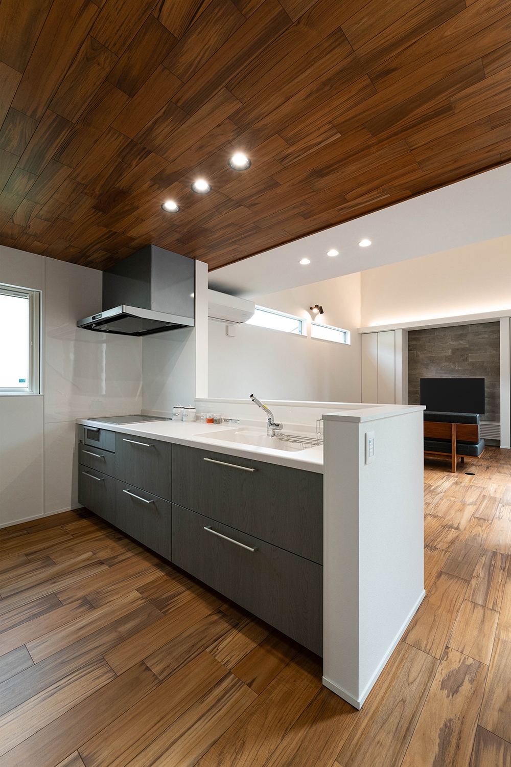 チーク材の天井が特徴的なダイニングキッチン。木の温もりが空間全体に広がり、落ち着いた雰囲気を演出