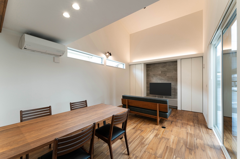 吹抜けの開放感と、ウッド調の天井が温かみを加えたリビング・ダイニング。中庭に面した大きな窓が光を取り込み、家族が自然と集まりたくなるような空間