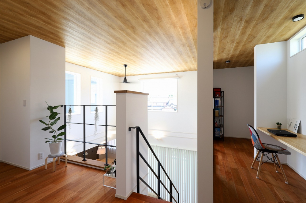 吹き抜けのあるリビングを中心に、キッチンから主寝室、水まわりまでがひと続きになったワンフロアの間取りは、日々の家事や子育てをスムーズにしてくれる快適な動線設計。2階には、プライベートを大切にできる洋室や書斎スペースもあり、家族のライフスタイルに寄り添う住まいです。