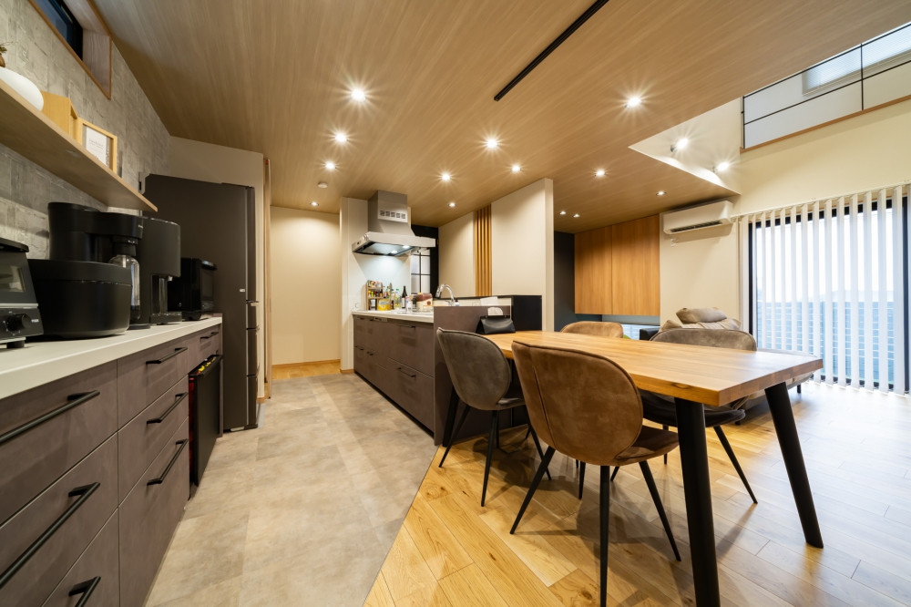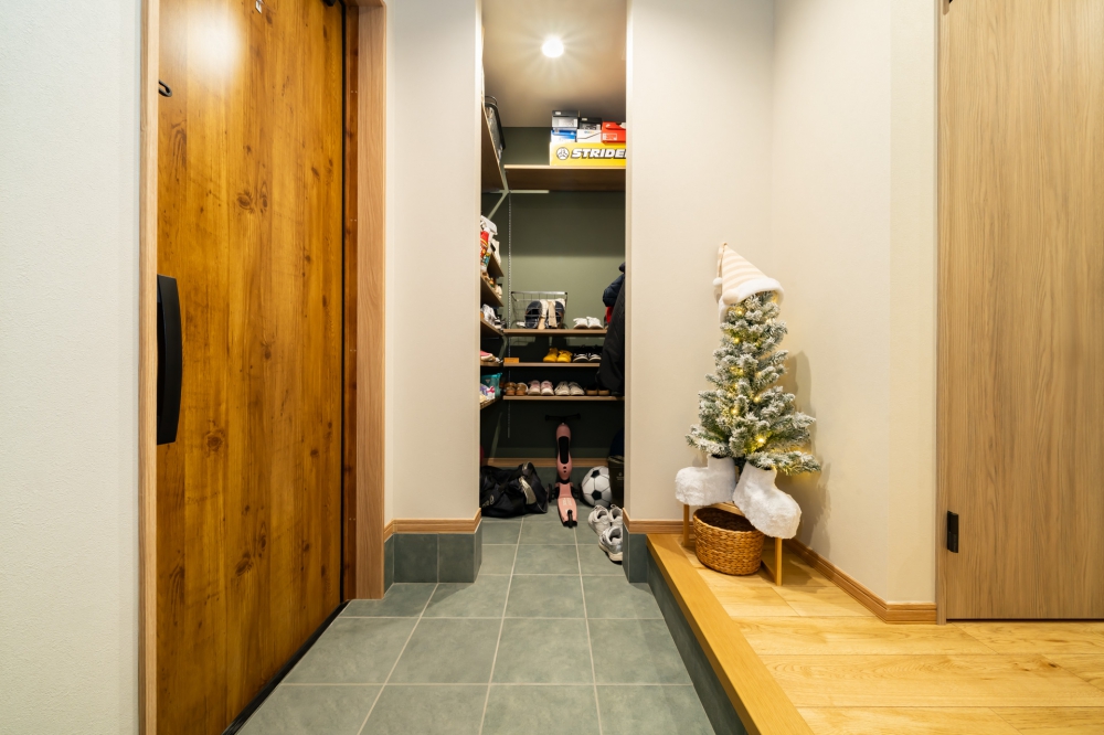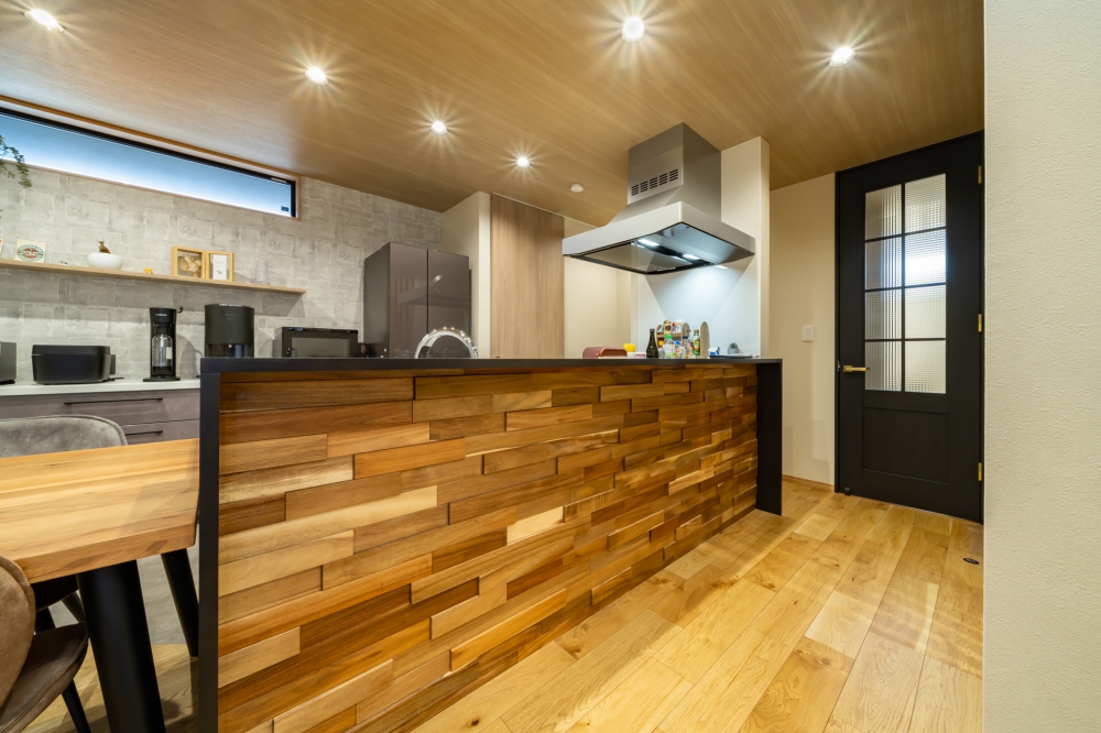 ご家族のライフスタイルに寄り添いながら、お好みのテイストを随所に反映した、こだわりの住まい。 重厚感のある外観に、ナチュラルで温かみのある内装が調和し、落ち着きと上質さを兼ね備えた空間に仕上がっています。