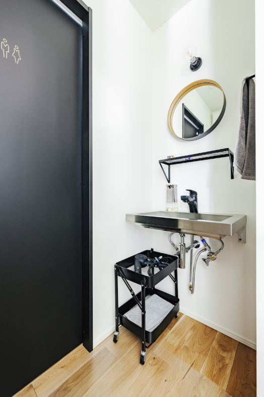 丸い鏡がアクセントの手洗いカウンター