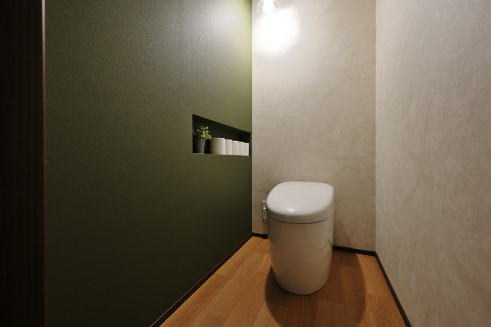 トイレットペーパーニッチを採用。緑のアクセントクロスで落ち着いた空間に。