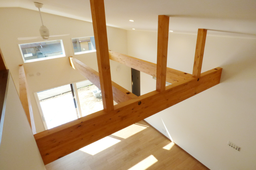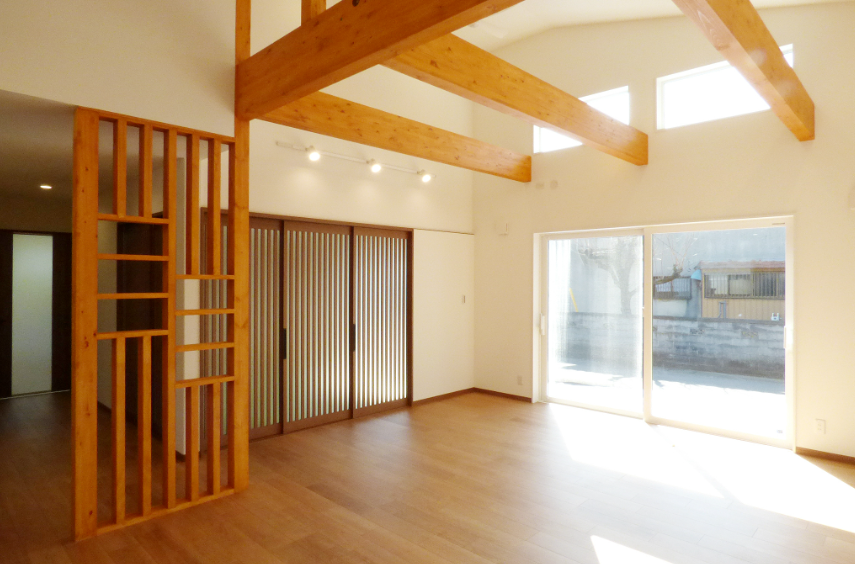 片流れ屋根のシックな外観に、木の梁が映える開放的なリビングが広がる住まい。