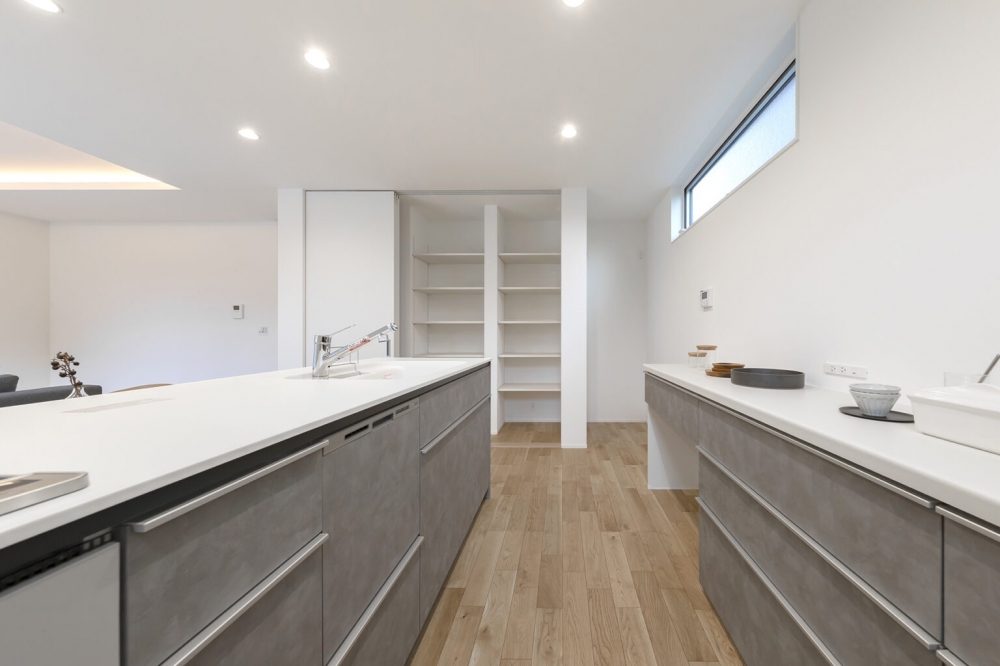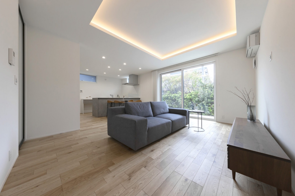 折り上げ天井と間接照明が、柔らかな光と上質感を演出するリビング。生活感を徹底的に隠す「魅せるキッチン」は、美しさと使い勝手を両立しました。リビングと繋がるテラスは、BBQが楽しめる第二のアウトドアリビング。25坪のコンパクトな平屋ながら、視線の抜けと光の設計で圧倒的な開放感を実現。1800万円台で叶えた、シンプルで贅沢な暮らしの拠点です。