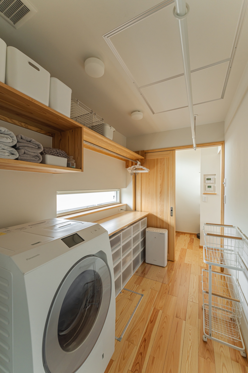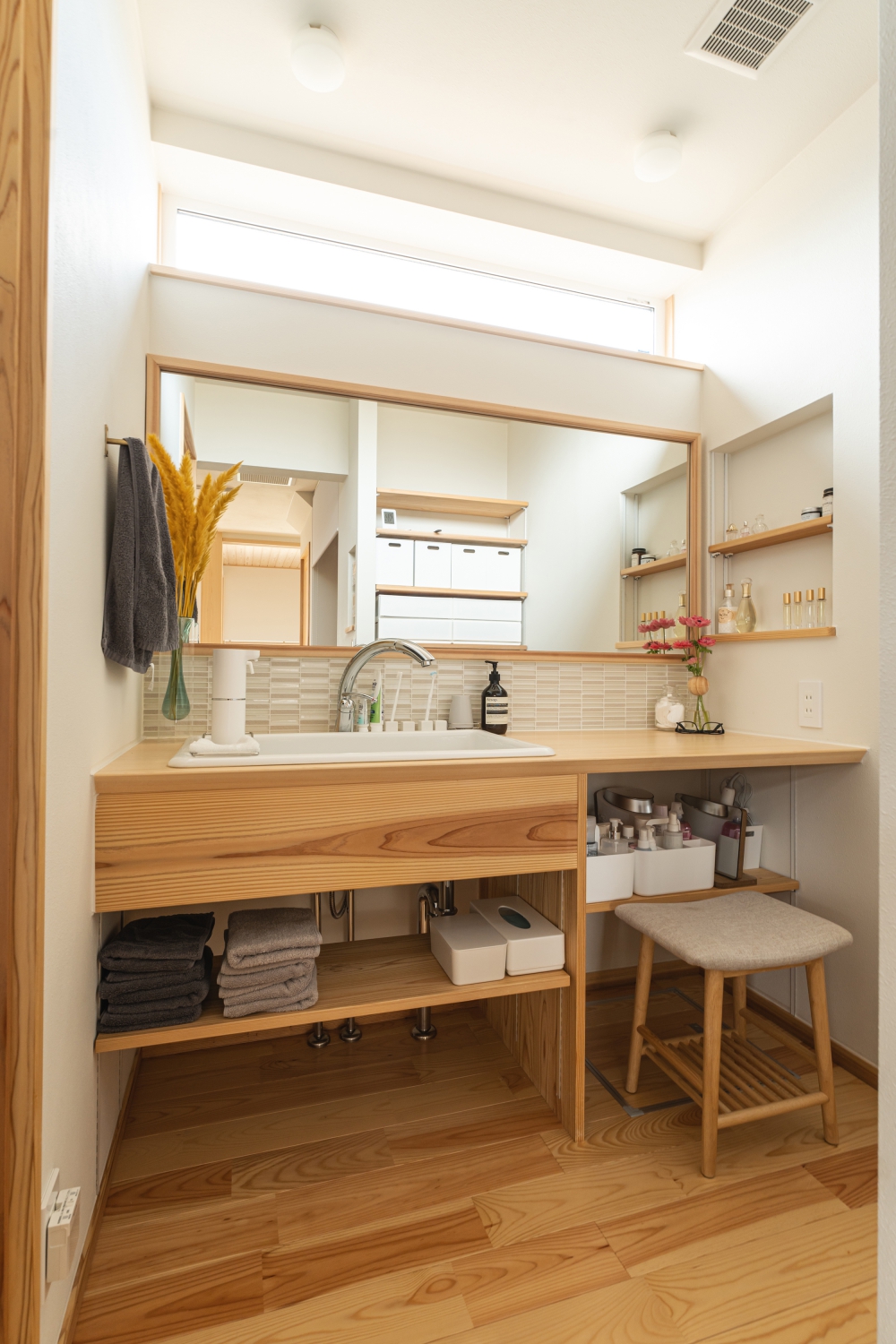 人にもペットにもやさしい住まいをご希望され、温度が安定する全館空調や自然素材の採用、小屋裏や床下を活用した大容量収納をご提案しました。家事動線や掃除しやすいペットスペースにも配慮。玄関や廊下まで快適な室温を保ち、一年を通して心地よく過ごせます。