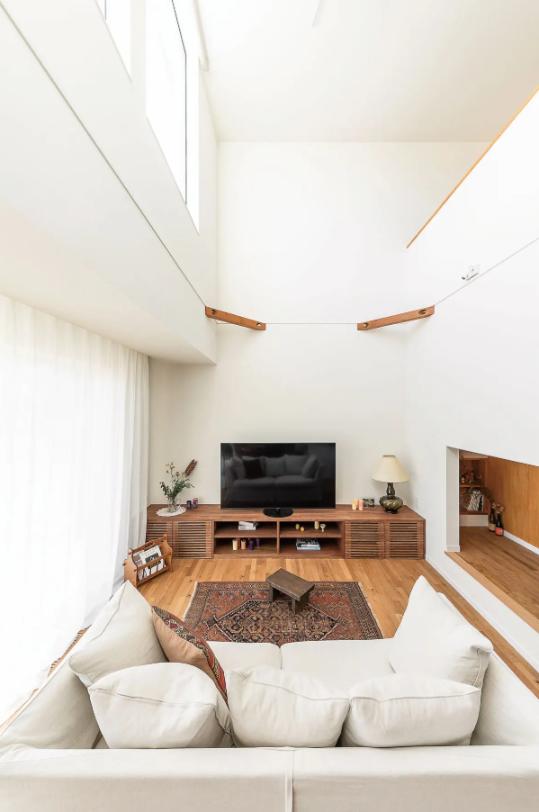 冬の日射取得を考慮した吹き抜け、夏の日射遮蔽に配慮した空間設計など、パッシブデザインが随所に。TVボードの右下には、同社オリジナル仕様での全館空調を行う床下エアコンを収めた。吹き抜けは2階ホールとつながっている