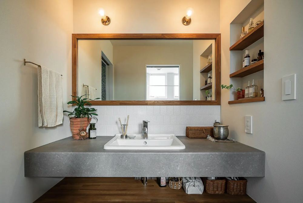 玄関ホール脇にあり、スムーズな手洗い動線を叶えた洗面スペース。メラミンカウンター、ワイドな鏡、アラベスク柄のタイルなど、細部まで抜かりなくお洒落