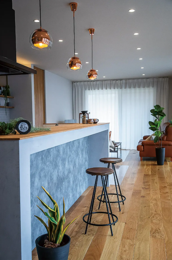 LDKの西側にあたるカウンター前のスペースは、ゆったりとした広さを確保。昼に夜に、さまざまな表情を見せてくれる。インテリアは和モダンと北欧テイストをミックスした「ジャパンディ」がテーマ