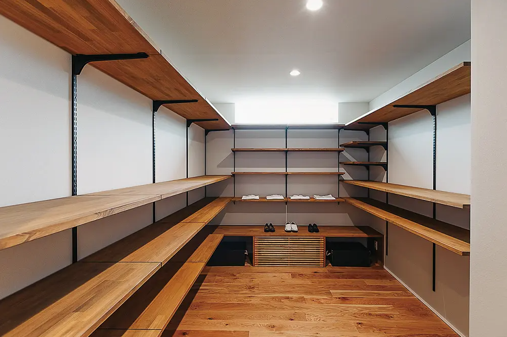 セレクトショップのような約5帖のファミリークローゼット。高窓から光が入り、明るさも持たせた空間になっている